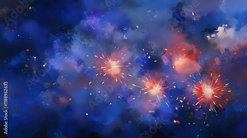 © Watie2781, Fototapeta premium Vibrant Colorful Fireworks Display Over a Night Sky with Hues of Blue and Red in Abstract Artistic Style, Capturing the Joy of Celebration and Festivities