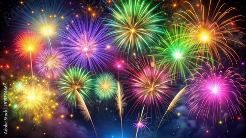 © Sirinporn, Naklejka premium Vibrant colorful fireworks explode in the dark night sky, filling the atmosphere with radiant bursts of pink, green, blue, and yellow sparkling lights.
