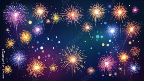 © Design Stock, Naklejka premium Vibrant colorful fireworks exploding in a dark night sky creating a festive celebratory atmosphere with sparkling lights