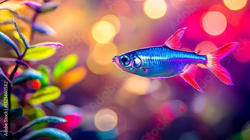 Fototapeta premium Vibrant, colorful fish in aquarium. Bokeh background creates a magical atmosphere