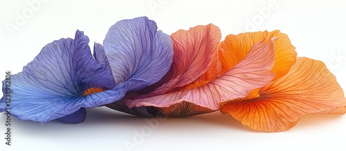 © Kultivad, Fototapeta premium Vibrant colorful flower petals in blue purple pink and orange tones on a white background with Copy Space