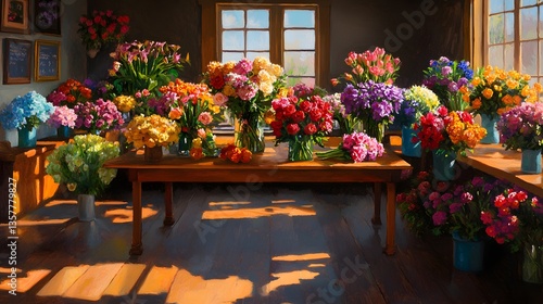 © CleanFrame, Fototapeta premium Vibrant Colorful Flower Shop Bouquet Display Sunlit Wooden Table