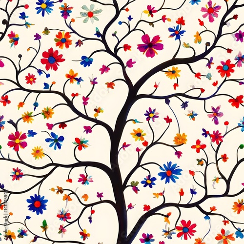 Fototapeta premium Vibrant Colorful Flower Tree Art Print, Blooming Floral Tree of Life