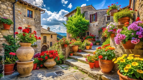 Naklejka premium Vibrant colorful flowers spill from ancient stone vases in a picturesque Italian village, surrounded by rustic stone buildings, vines, and lush greenery under a bright blue sky.