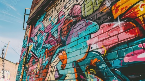© BrandwayArt, Obraz premium Vibrant Colorful Graffiti Decorates Urban Brick Wall in Bright Afternoon Light