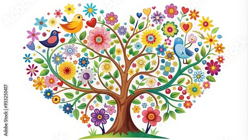 Fototapeta premium Vibrant colorful illustration of a family tree with blooming flowers and birds surrounding a central heart symbolizing love and unity between parents and children.