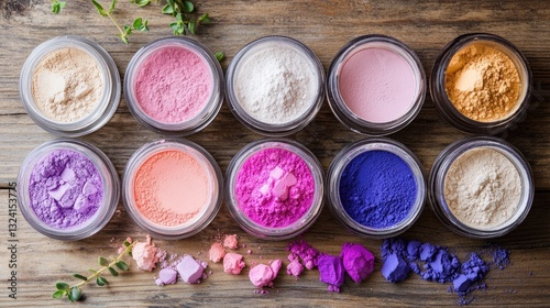 © SETSU 21, Naklejka premium Vibrant Colorful Powders in Clear Jars on Rustic Wooden Surface