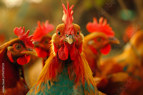 Fototapeta premium Vibrant colorful rooster and hens on a close-up farm portrait. Perfect piece...