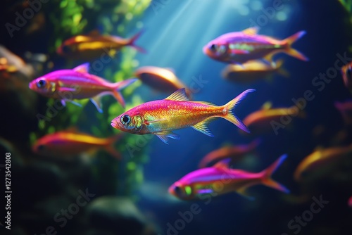 © Vibu design gallery, Fototapeta premium Vibrant, colorful schooling fish swim in a dark blue aquarium, illuminated by a light beam.