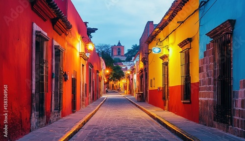 © Agung, Fototapeta premium Vibrant Colorful Street at Dusk: Architecture, Cobblestone Road, and Twilight Beauty, Illuminating Cityscape, Charming Old Town