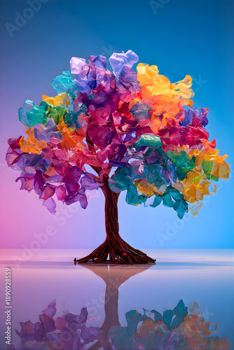 Fototapeta premium Vibrant colorful tree with rainbow leaves on reflective surface gradient...