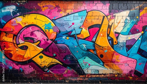 Fototapeta premium Vibrant colorful urban graffiti mural decorates city wall with dynamic...