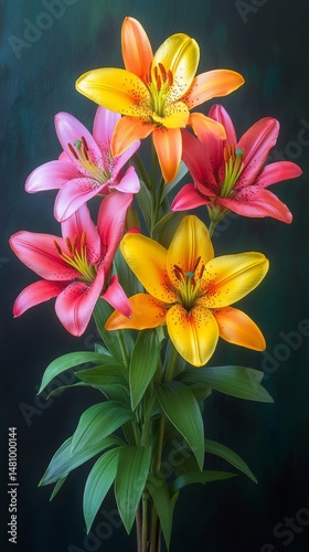 © Julia, Fototapeta premium Vibrant colors including yellow, orange, and red are displayed by lily blossoms, which are set amongst dark green leaves