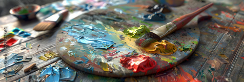 Fototapeta premium Vibrant colors mix on messy paint palette, Close-up of a paintbrush adding...