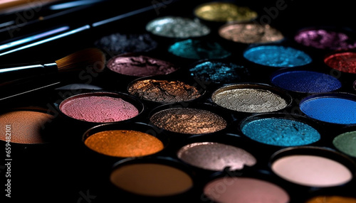 Naklejka premium Vibrant colors of eyeshadow palette create glamorous make up collection generated by AI