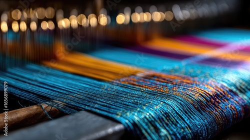 Naklejka premium Vibrant Colors of Threads on a Loom Creating Beautiful Patterns in Traditional Weaving Process