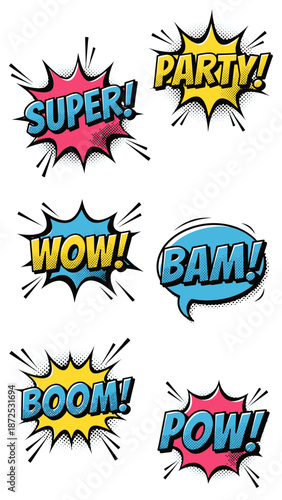 © PAPA, Obraz premium Vibrant Comic Speech Bubbles Explode with Energetic Text and Dynamic Graphics