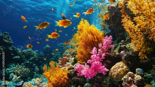 © Roun Sreylak, Naklejka premium vibrant coral garden under the ocean, filled with a variety of colorful corals, fish, and invertebrates living in harmony.