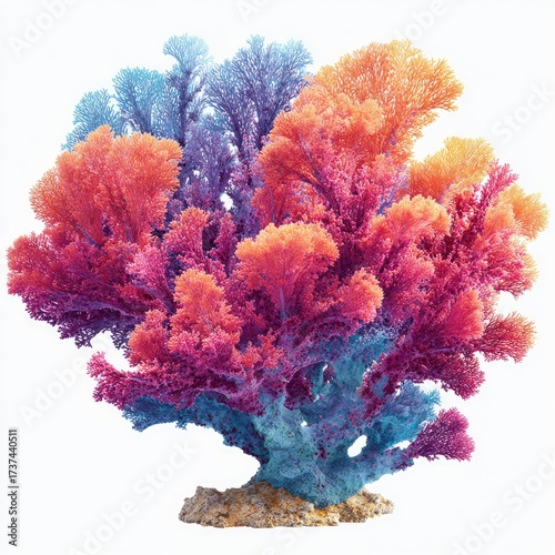 © Soto, Fototapeta premium Vibrant coral-like sculpture with pastel pink, orange, and blue hues, set on a small, light beige base, isolated against a white background