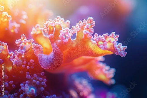 Naklejka premium Vibrant coral polyps in warm ocean light, showcasing intricate textures and...
