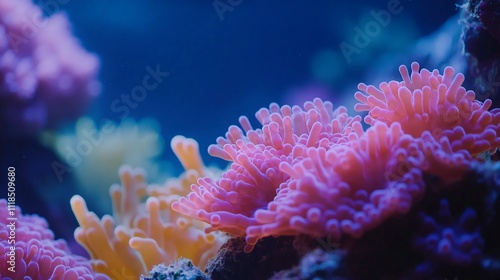 © NASIRUN77, Obraz premium Vibrant coral reef anemones in a vibrant aquarium.