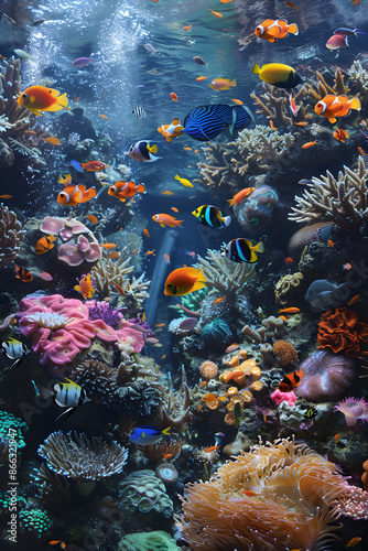 Fototapeta premium Vibrant Coral Reef Aquarium with Colorful Fish and Intricate Coral Formations...