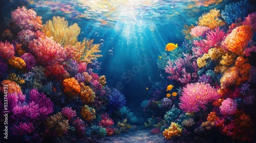 Fototapeta premium Vibrant coral reef, colorful fish, underwater scene.