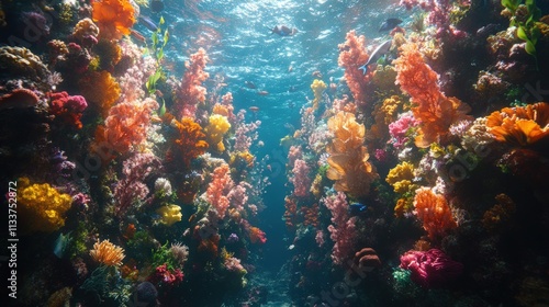 Fototapeta premium Vibrant coral reef, colorful fish, underwater scene.
