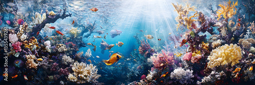 Fototapeta premium Vibrant Coral Reef Ecosystem: A Dynamic Underwater World of Colorful Corals and Diverse Marine Life