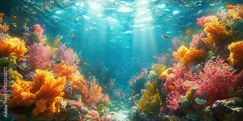 Fototapeta premium Vibrant coral reef ecosystem teeming with marine life and colorful corals in...