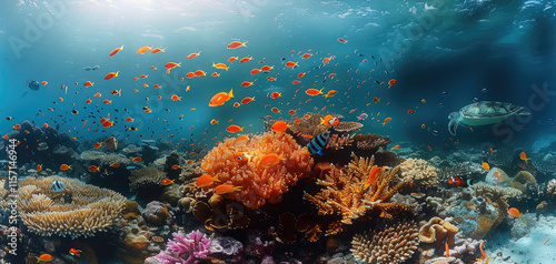 © visoot, Naklejka premium Vibrant coral reef ecosystems, schools of colorful fish swimming around glowing corals, turtles and manta rays gliding, clear blue seawater.