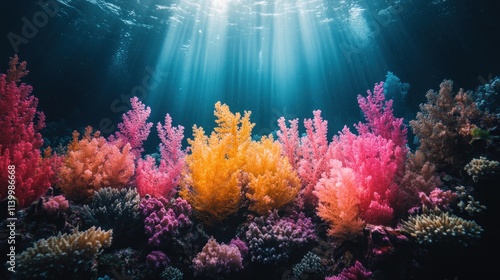 © Bejo Studio, Fototapeta premium Vibrant coral reef illuminated by sunlight underwater.