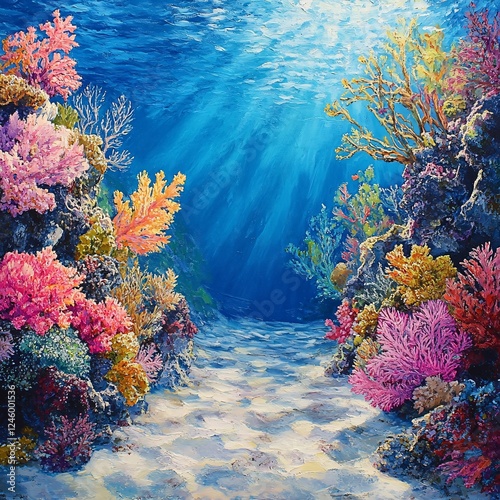 Naklejka premium Vibrant Coral Reef Scene Underwater with Sunlight and Marine Life