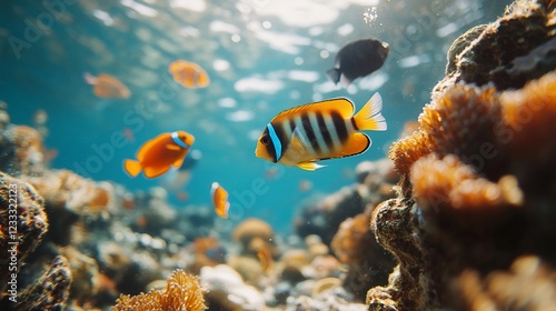 Fototapeta premium Vibrant coral reef scene with colorful fish swimming among corals in clear...