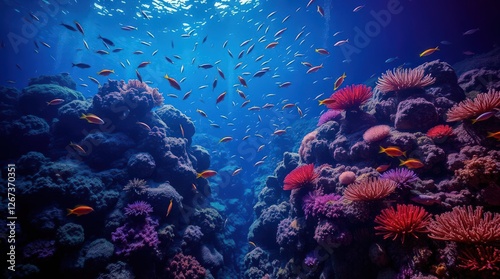 Fototapeta premium Vibrant Coral Reef Scene with Colorful Fish Swimming in Ocean Depths