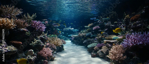 Fototapeta premium Vibrant coral reef scene with diverse fish, sunlight filtering through water, sandy path