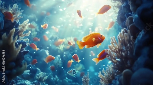 Fototapeta premium Vibrant coral reef scene with orange fish swimming in sunlit water.