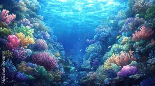Fototapeta premium Vibrant Coral Reef Scene with Sunbeams and Fish