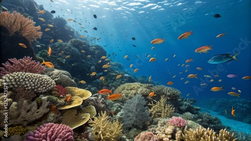 Naklejka premium Vibrant Coral Reef Seascape Underwater Composition with Diverse Fish and Coral, Ocean Life, Marine Ecosystem Coral Reef, Underwater Photography