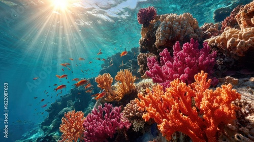 Obraz premium Vibrant coral reef, sunlight beams