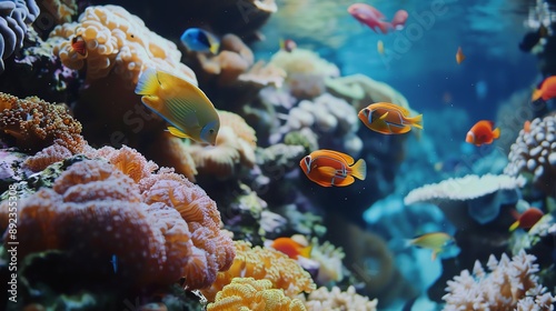 Naklejka premium Vibrant coral reef teeming with colorful fish, a picturesque underwater scene.