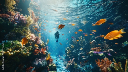 Naklejka premium Vibrant coral reef teeming with colorful fish and a diver.