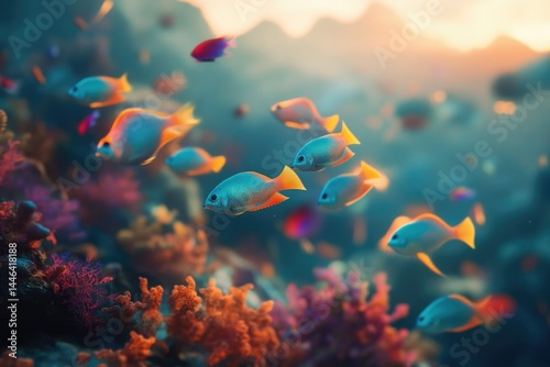 © jayantha, Fototapeta premium Vibrant coral reef teeming with colorful fish at sunset.