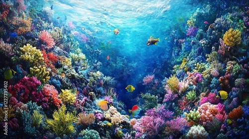 © Pichapob, Naklejka premium Vibrant Coral Reef Teeming with Colorful Fish Beneath Clear Water