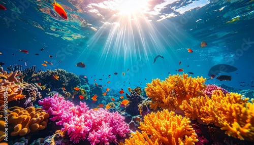 Fototapeta premium Vibrant coral reef teeming with colorful fish, illuminated by sunbeams...