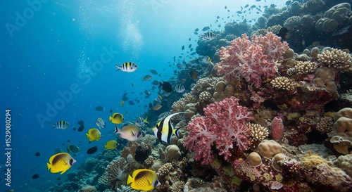 Fototapeta premium Vibrant coral reef teeming with colorful fish in a crystal-clear ocean underwater scene