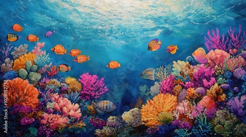 Fototapeta premium Vibrant coral reef teeming with colorful fish in crystal clear waters.