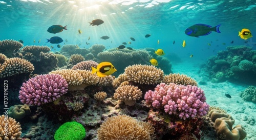 Fototapeta premium Vibrant coral reef teeming with colorful fish. Sunlight streams through the water, illuminating a variety of corals