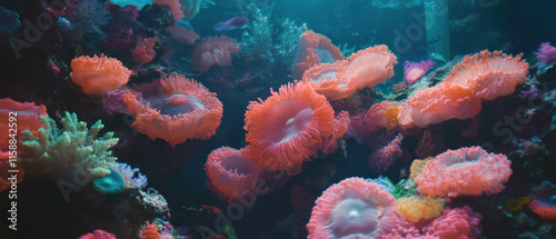 © annetdebar, Naklejka premium Vibrant coral reef teeming with colorful marine life in crystal-clear waters