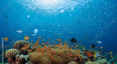 © nina, Naklejka premium Vibrant coral reef teeming with diverse fish species, sunlight filtering through the crystal-clear ocean water.